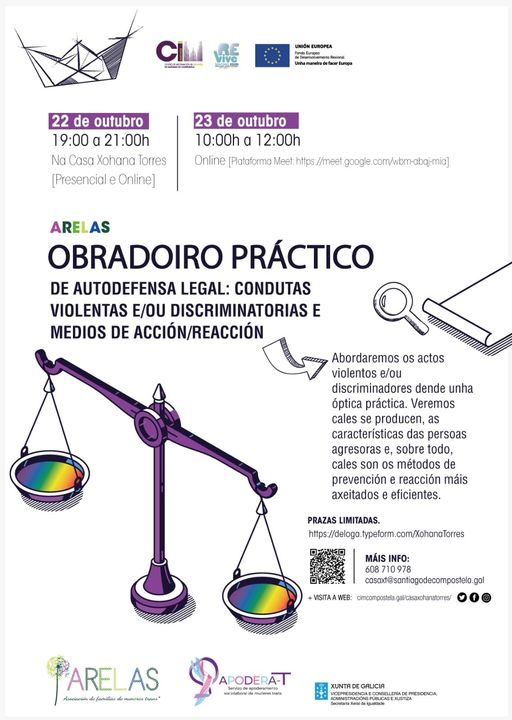 Seguindo coas actividades do outubro trans, dende Arelas, AFMT recomendámosvos moito esta acción formativa que impartirá o noso asesor xurídico, Miguel Vieito Villar, sobre Autodefensa legal ante condutas violentas e/ou discriminatorias e medios de acción/reacción. Este obradoiro forma parte do programa Apodéra-T, de apoderamento sociolaboral de mulleres trans de 16-30 anos, financiado pola Secretaría Xeral de Igualdade Igualdade na Rede https://asociacionarelas.org/old/gl/apodera-t-empodera-t/ . As datas son: